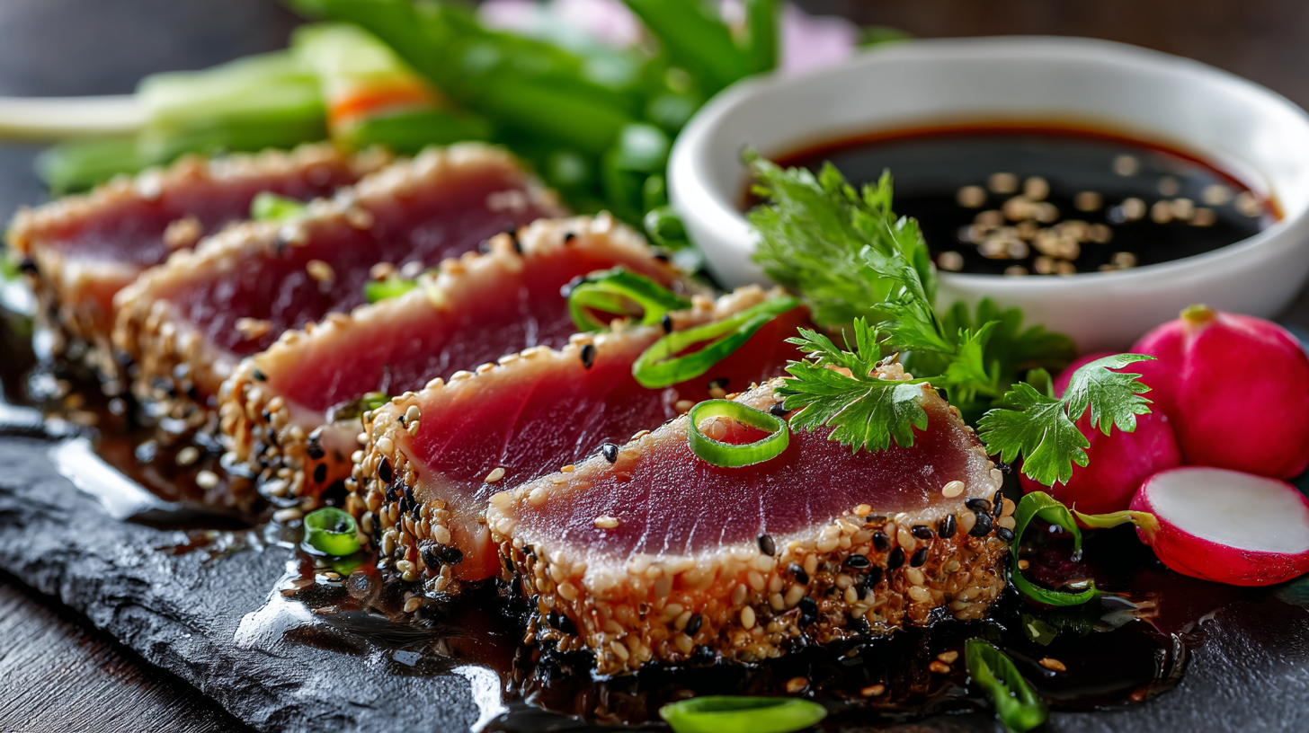 - 4Rol de tonijn direct door het sesamzaad en laat 5–10 minuten rusten (eventueel kort koelen voor strak snijden).