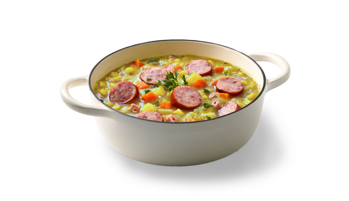 - 5Voeg de rookworst de laatste 10 minuten toe om op te warmen.